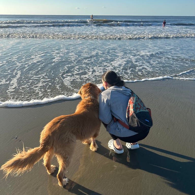 I currently live in Charleston, SC with my wonderful husband and our beautiful little family — three hens, Juno and Midge, our cat-dog duo we adopted in 2024.